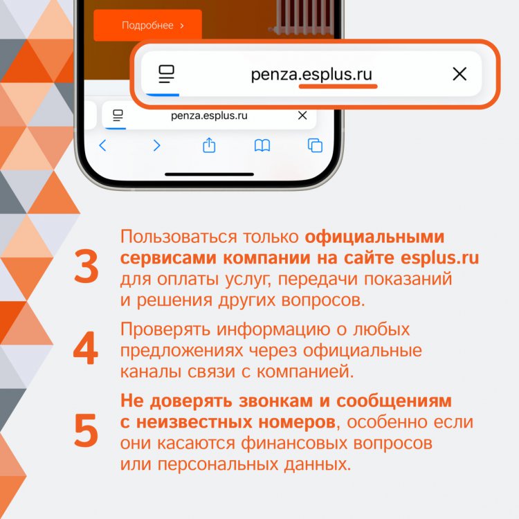 3. Пользоваться только официальными сервисами компании на сайте oren.esplus.ru для оплаты услуг, передачи показаний и решения других вопросов.