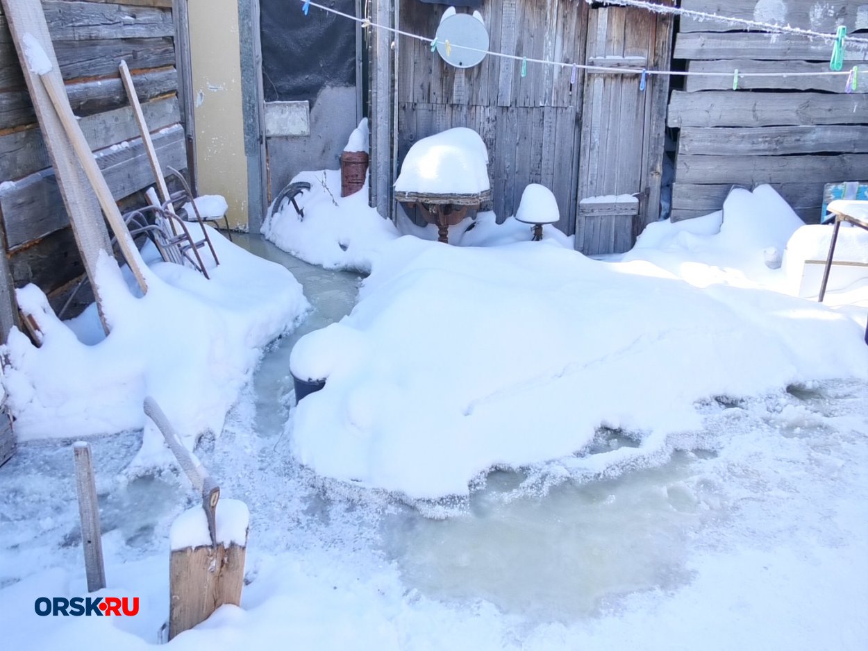 Как мы ранее уже сказали, через двор Бориса Жумакебова идет общий водопровод, где и произошла коммунальная авария. И, как мы с вами видим, вода разлилась по территории двора и идет дальше к забору. И уже под этим забором вода вытекает на улицу Полевую и расходится по соседским дворам. Кстати, из-за этой коммунальной аварии улица Полевая покрылась тонким льдом, под который очень просто провалиться. Конечно, здесь неглубоко, но приятного в минус 25 мало.