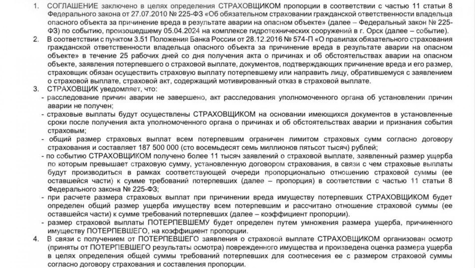 Выписка из договора между АО «СОГАЗ» и жителем Орска, пострадавшим от паводка.