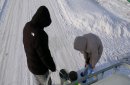 Вот здесь расстилаю клеёнку. Снег набираю в одну чашку, в другую чашку горячую воду наливаю. Это вот я истинно говорю. Горячей мочалкой пошоркаю, а потом снежком. Ну, конечно, не в таком состоянии. Вот и всё.