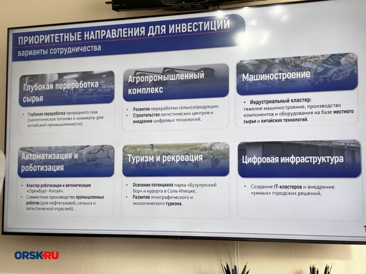 Особое внимание Антон Ефимов уделил...сотрудничеству с Китаем. В презентации, которую вице-губернатор показал журналистам, был слайд «Приоритетные направления для инвестиций». И из шести направлений три оказались связаны с Поднебесной! Оренбуржье планирует отправлять в Китай топливо и химикаты, а взамен получать технологии для тяжёлого машиностроения и производства промышленных роботов. Кроме того, рассматривается возможность появления в регионе предприятия китайского автопрома.