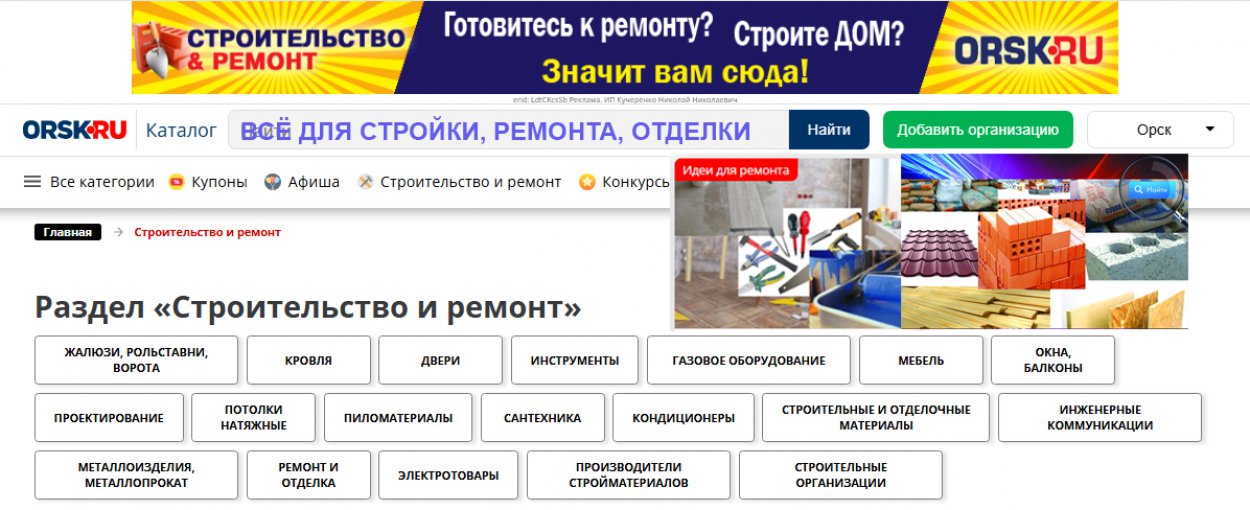 Планируете ремонт или стройку? Необходимые обои, кафель или линолеум, двери или окна поможет найти раздел «Строительство и ремонт». В разделе есть 19 рубрик, включающие оконные фирмы, магазины отделочных и строительных материалов, ремонтные бригады, а также: сантехника, двери, мебель, металлоизделия, пиломатериалы, кровля и мн. др.