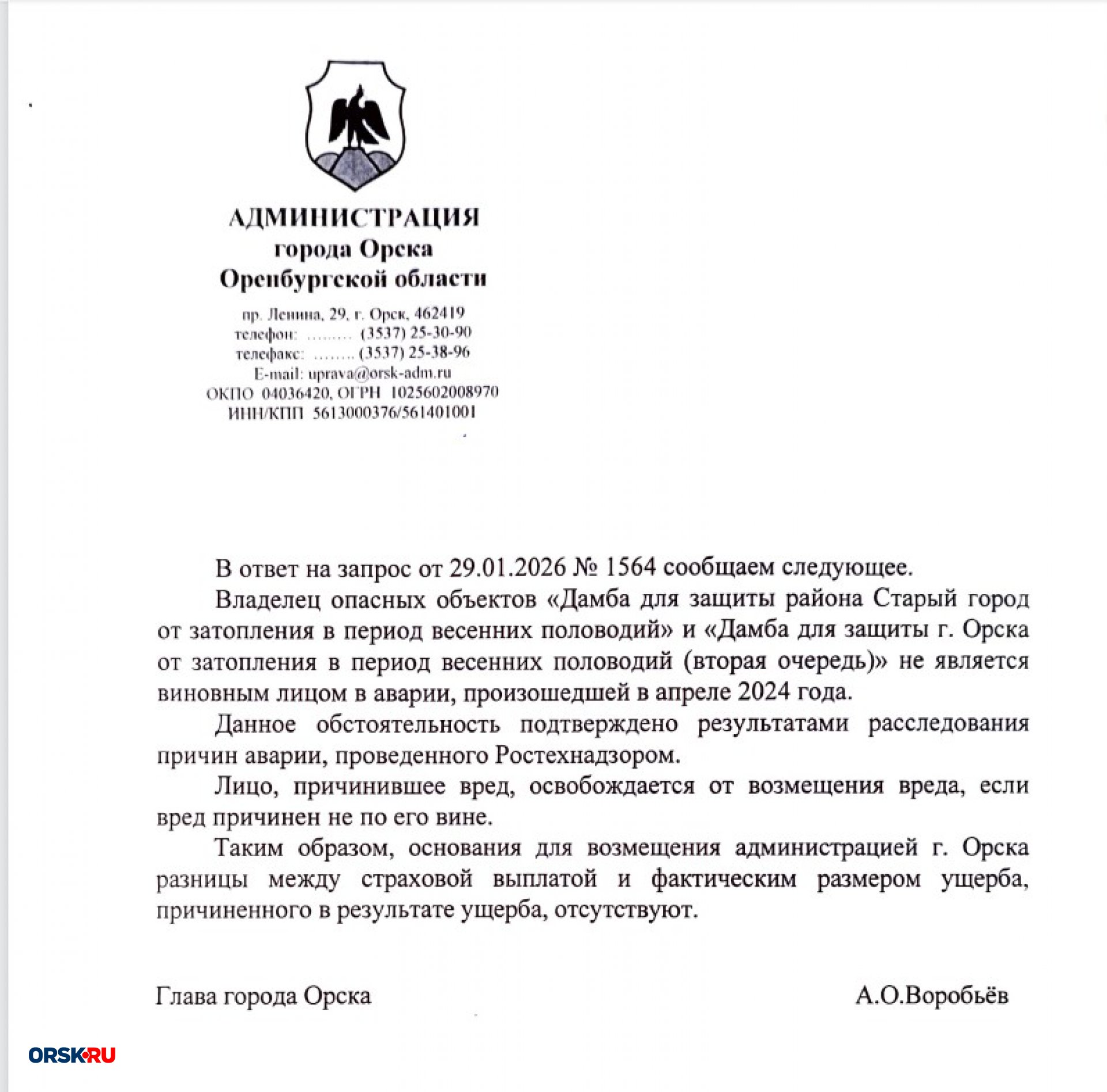 В обосновании своей невиновности администрация ссылается на якобы там установленный факт, на некое заключение или решение Ростехнадзора, принятое по итогам проведённой проверки. Здесь тоже могу прокомментировать, что само по себе решение Ростехнадзора, который не увидел признаков вины в действиях или бездействии владельца источника повышенной опасности и не привлёк его в связи с этим к ответственности, вовсе не означает отсутствие вины. В данном случае суд опять же будет давать оценку всем в совокупности представленным сторонами доказательствам, и решение Ростехнадзора — это лишь один из многих видов доказательств, которые суд будет оценивать. Это не решающее доказательство, это не предопределяющее доказательство, это даже не, в принципе, утверждение, нет оснований сегодня утверждать, что установлено отсутствие вины. Потому что суд ещё не дал никакой оценки, нет судебного акта, вступившего в законную силу, о том, что отсутствует вина администрации в причинении вреда жителям города Орска.
