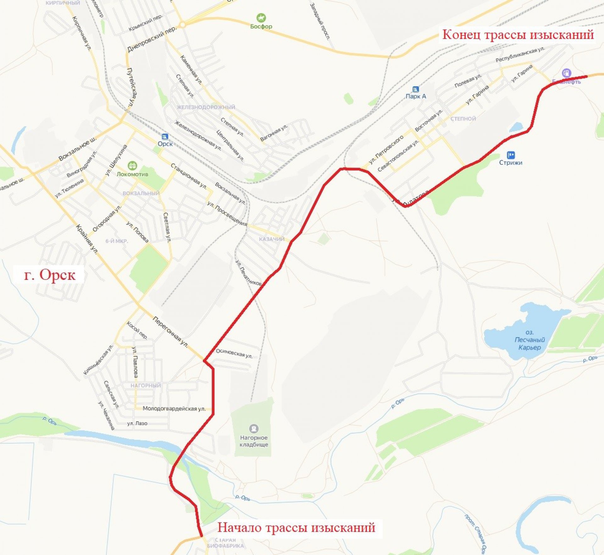 Если проще — речь идет об участке от Старой Биофабрики через реку Орь, через посёлки Нагорный, Казачий и Степной до участка за улицей Гарина.