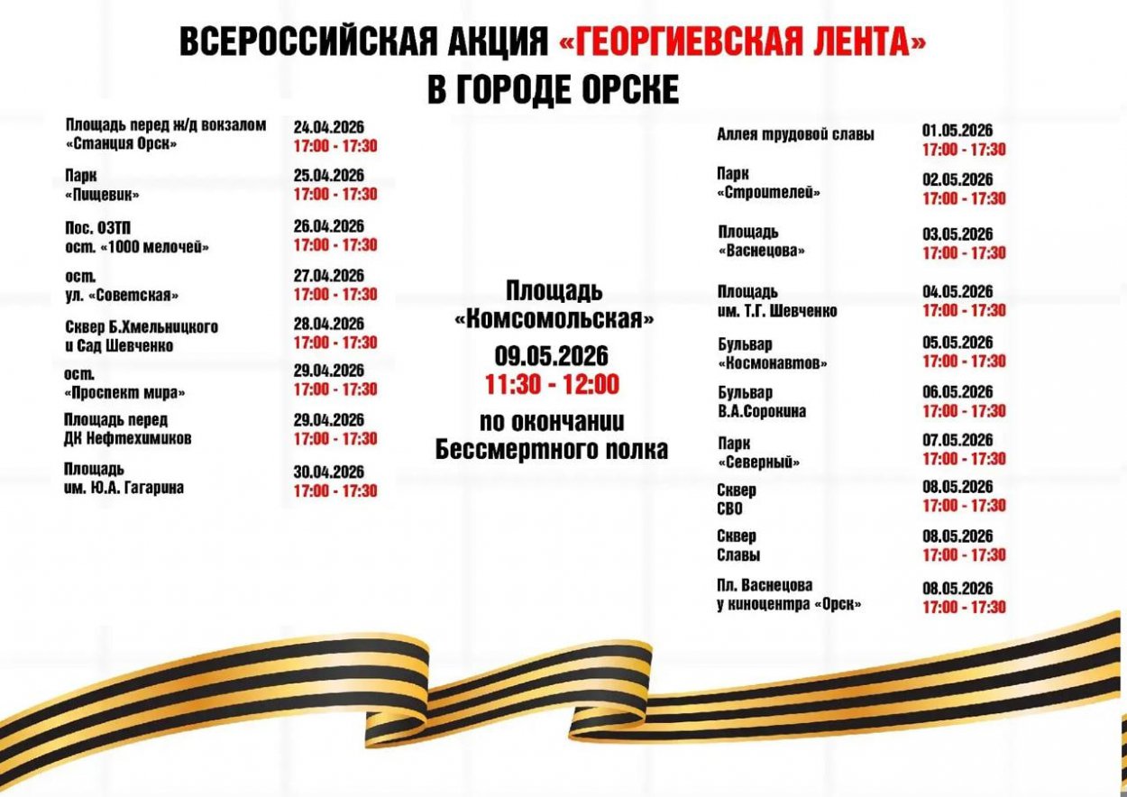 В Орске стартовала акция «Георгиевская лента», приуроченная ко Дню Победы. Волонтёры раздают символ памяти всем желающим — получить ленту можно на разных площадках города до 9 мая